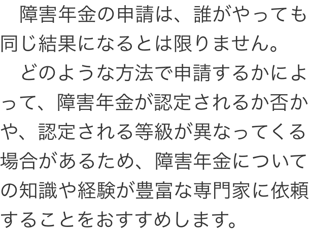 Q障害年金の申請は、どの専門家に依頼しても同じですか?